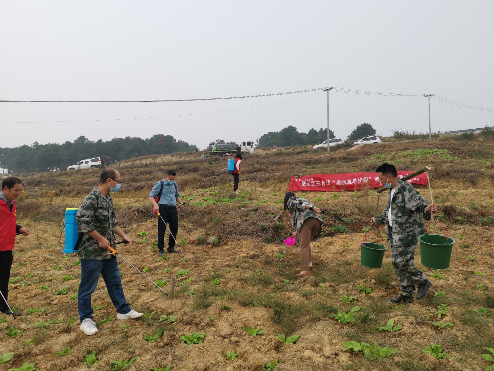 抗旱“渴”不容緩,關(guān)注到這一情況,為確保新耕種的糧食蔬菜能夠順利通過驗收,三合小組政協(xié)委員深入一線,開展送水保綠活動。市政灑水車保障用水,委員和志愿者們采用噴霧器背水、水桶擔(dān)水等方式對菜苗進(jìn)行澆灌,為作物送去“甘霖”。在田間地頭,兩輛灑水車有序提供用水,政協(xié)委員和志愿者們彎著腰低著頭,認(rèn)真地進(jìn)行著澆水灌溉工作,確保每一株嫩苗都能“喝飽水”。