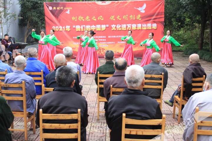 活動現(xiàn)場,區(qū)民樂團全體團員為老人們帶來歌曲、舞蹈、器樂演奏等形式多樣的文藝節(jié)目。嘹亮的歌聲、優(yōu)美的舞蹈……臺上演員們演得精彩,臺下老人聽得如癡如醉,看得津津有味。