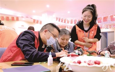 當(dāng)天,區(qū)民政局還組織志愿者來到璧城街道養(yǎng)老服務(wù)中心,與老人們一起做手工、話家常。